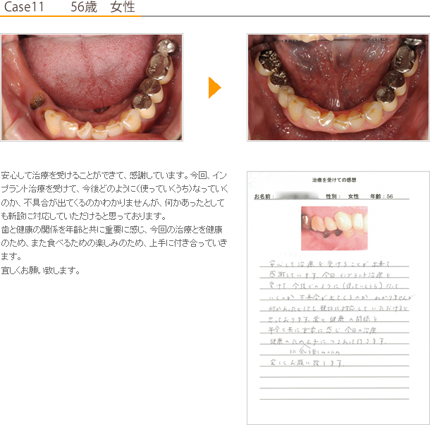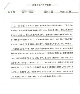 今では何でもおいしく食べることができています。よく噛んで食事をおいしいと思って摂ることが幸せなことだと久しぶりに思い出すことができたようです。中條先生には元気で生きていくための大切な根っこの部分をしっかりと修復していただきました。先生にインプラント治療をしていただき本当によかったと思っています。ありがとうございました。。
